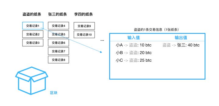 1. 发起交易的时候,发起人会收到一张小纸条,他需要将交易记录比如说“盗盗转账给张三40元”写在纸上。说来也神奇,当写完的那一刹那,在小纸条的背面会自动将这段交易记录格式化成至少包含了“输入值”和“输出值”这两个重要字段;“输入值”用于记录数字货币的有效来源,“输出值”记录着数字货币发往的对象。