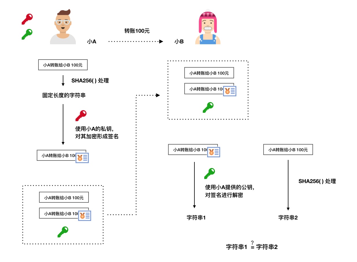 4. 第四步:当小B收这三样东西,首先会将明文的小纸条进行SHA256()处理,得到一个字符串,我们将其命名为“字符串2”。然后,小B使用小A公布的公钥,对发过来的数字签名进行解密,得到另外一个“字符串1”。通过比对“字符串1”和“字符串2”的一致性,便可充分证明:小B接受到的小纸条就是小A发出来的小纸条,这张小纸条在中途没有被其他人所篡改;且这张小纸条确实是由小A所编辑。