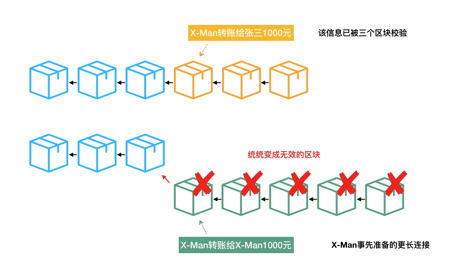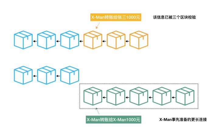 5. 大功告成,X-Man拥有了一条更长的区块链条,那些较短、存放着“X-Man转账给张三1000元”的区块链,以及在区块链世界里那则真实转账行为被一同成功销毁。(?)
