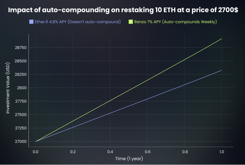 以下是自动复利的重要性示例,以及 ezETH 如何为用户带来更多奖励: